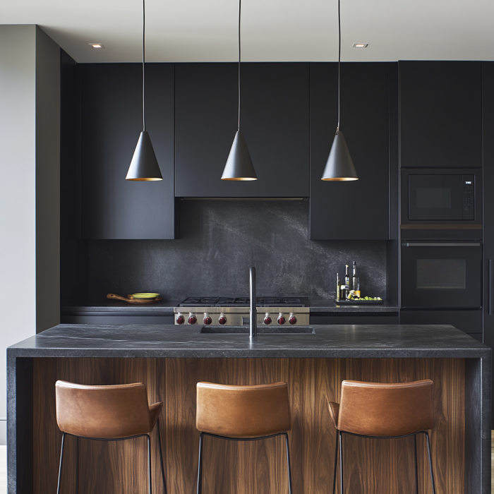 Ergonomics meet atmosphere: matte black cabinetry, concrete surfaces, and metal accents offer an urban edge, while warm lighting and textured neutrals soften the mood. A palette of black, grey, and white, occasionally balanced with raw wood or stone, keeps the space both grounded and striking.